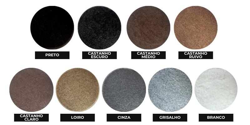 Todas as cores em um só lugar, esta exposição integra um barco de 12,50gr, de cada cor. Preto, castanho escuro, castanho médio, Castanho Claro, Castanho Auburn, Louro, Ash, cinza e branco.
