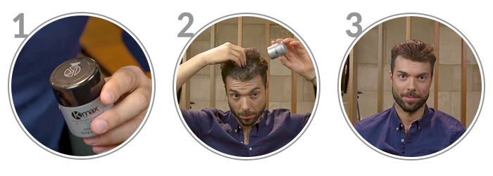 Coloque o frasco a uma distância de cerca de 10 centímetros acima da cabeça, faça pequenos toques com o dedo indicador, borrifando as microfibras uniformemente nas áreas que mais necessitam. Observe que o aplicador Kmax foi projetado especificamente para evitar o desperdício do produto. , garantindo uma dispersão uniforme e constante do produto, você também pode utilizar o Aplicador Spray Kmax para aplicar as fibras.
